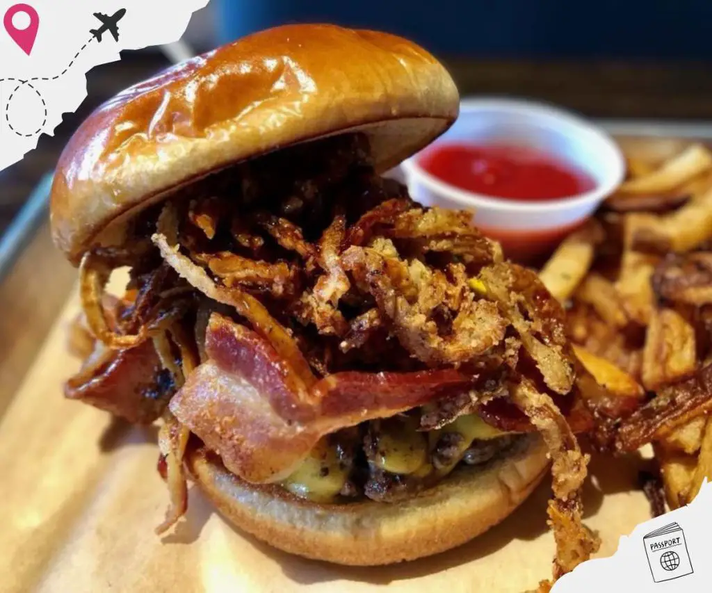 - Smokehouse Burger: Topped with pork belly, massive onion ring, smoked gouda, and mango habanero BBQ sauce.