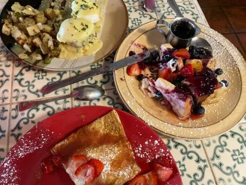 Visit Comfort Cafe for scratch-made breakfast featuring their famous Crabby Benny and brown sugar pecan pancakes, all supporting a nonprofit addiction recovery mission.