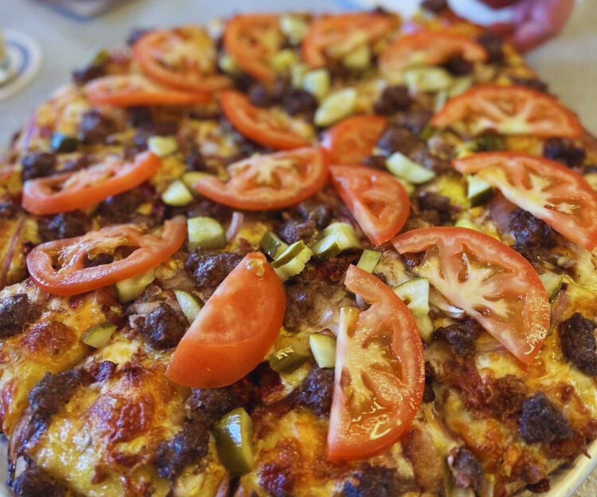 ’55 Bacon Cheeseburger pizza: Mustard sauce, pepper-jack, bacon, ground beef, tomatoes, and pickles bring full cheeseburger energy to a pizza crust, making it a go-to choice for adventurous eaters chasing something more exciting than a standard meat pie. 🍔🍕