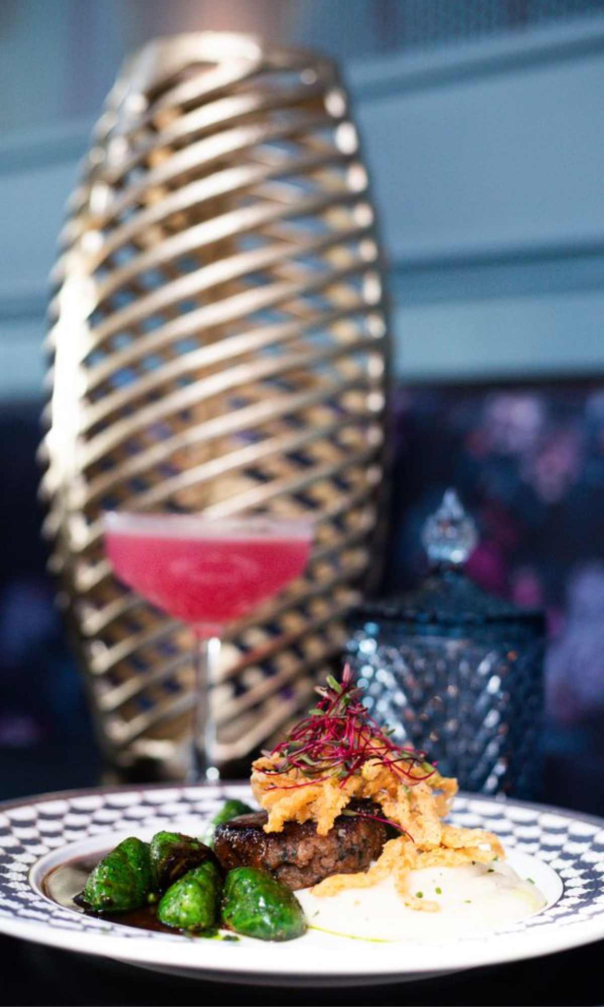 Benny and Mary’s design exudes elegance and comfort, featuring dark velour-covered seating, rich wooden accents, tasteful chandeliers, art-adorned walls, and bookcases that enhance the ambiance. Music volume is just right and allows for undisturbed conversations, and the spacious layout ensures privacy between tables.