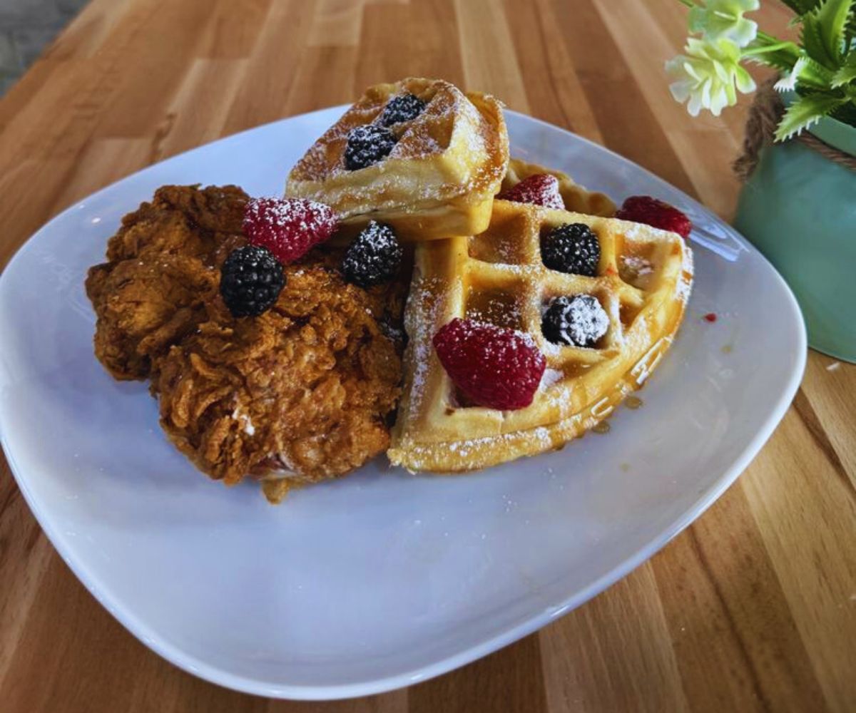 Chicken & Waffles with Fresh Fruits (Brunch): Golden fried chicken piled on warm waffles, finished with syrup, honey, and a mix of strawberries, bananas, and blueberries that gets frequent shout‑outs in brunch write‑ups and is the “Wow, we have to come back here” kind of plate for many fans. 🍗