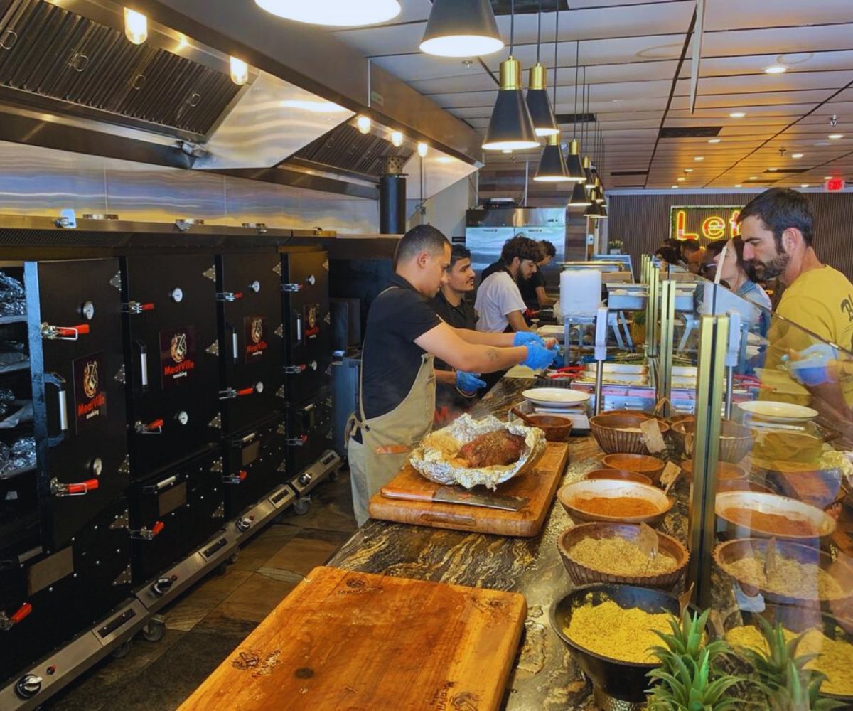 The vibe at MeatVille Smoking leans modern, relaxed, and family-friendly, more bright Mediterranean meat market than dark, rustic smoke shack.