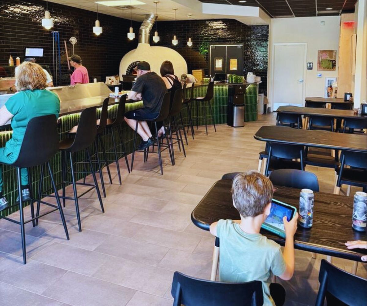 Exposed textures, warm lighting, and the constant glow of the wood‑burning oven create an inviting room that feels casual enough for flip‑flops yet special enough for date night.