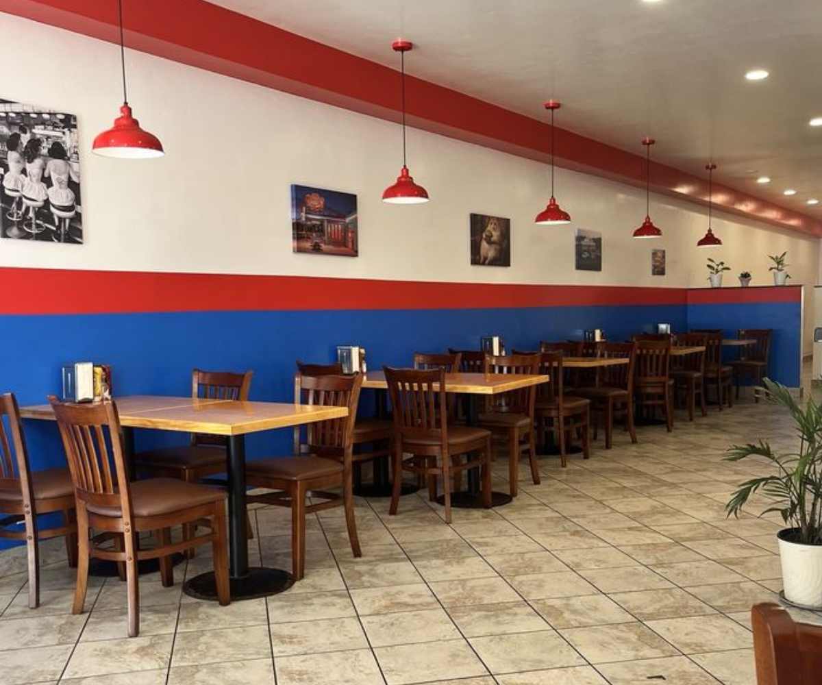The space features red bouncy booths, vinyl records decorating the walls, and classic oldies playing overhead—creating that nostalgic burger joint vibe.
