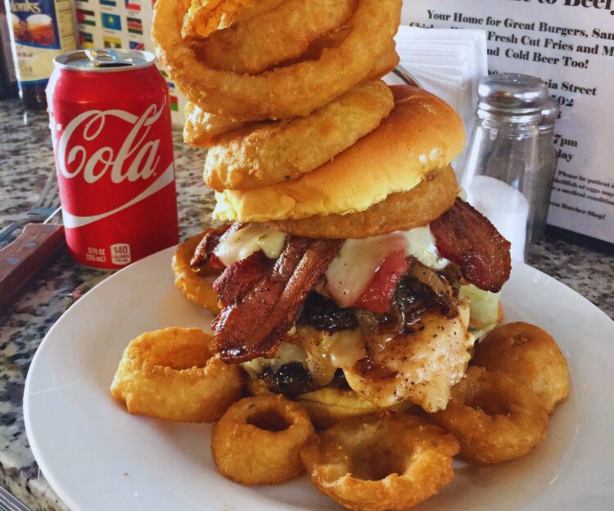 The Moo, The Cluck, and The Oink!: This towering signature burger starts as a cheddar cheeseburger, then stacks on grilled chicken breast, Swiss, mushrooms, pastrami, bacon, grilled onions, another burger patty, pepper jack, BBQ sauce, and an onion ring on top that serious carnivores need to try!🍔
