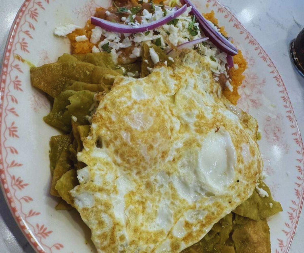 Breakfast Chilaquiles / Chilaquiles Rojos: A dish praised by diners for its saucy tortillas and toppings that offer just the right kick, it’s a great choice for a wake‑up call on a plate for lazy weekend mornings and late starts alike.