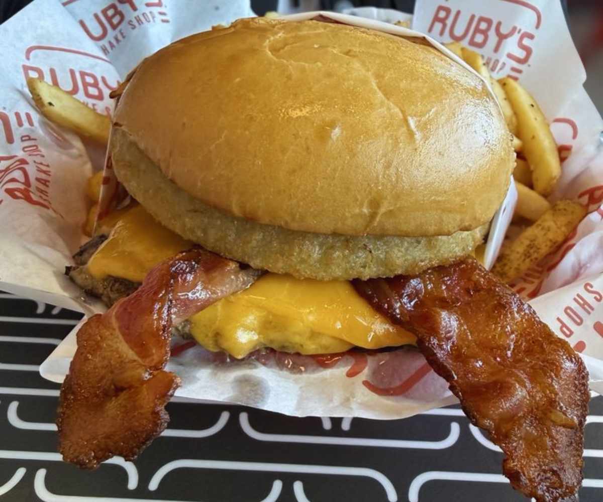 Hickory Burger: This loaded creation stacks cheddar cheese, smoked bacon, lettuce, tomato, hickory BBQ sauce, and crispy onion rings with Ruby’s burger sauce—it’s messy, indulgent, and absolutely worth every bite for $12.99.