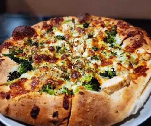 Italian Cheese, Chicken, Broccoli, and Garlic Pizza (Served White): This white pizza without red sauce features tender chicken pieces, fresh broccoli, and garlic over a cheese base, offering a lighter but equally satisfying option that regulars swear by as an institution favorite worth ordering every visit.