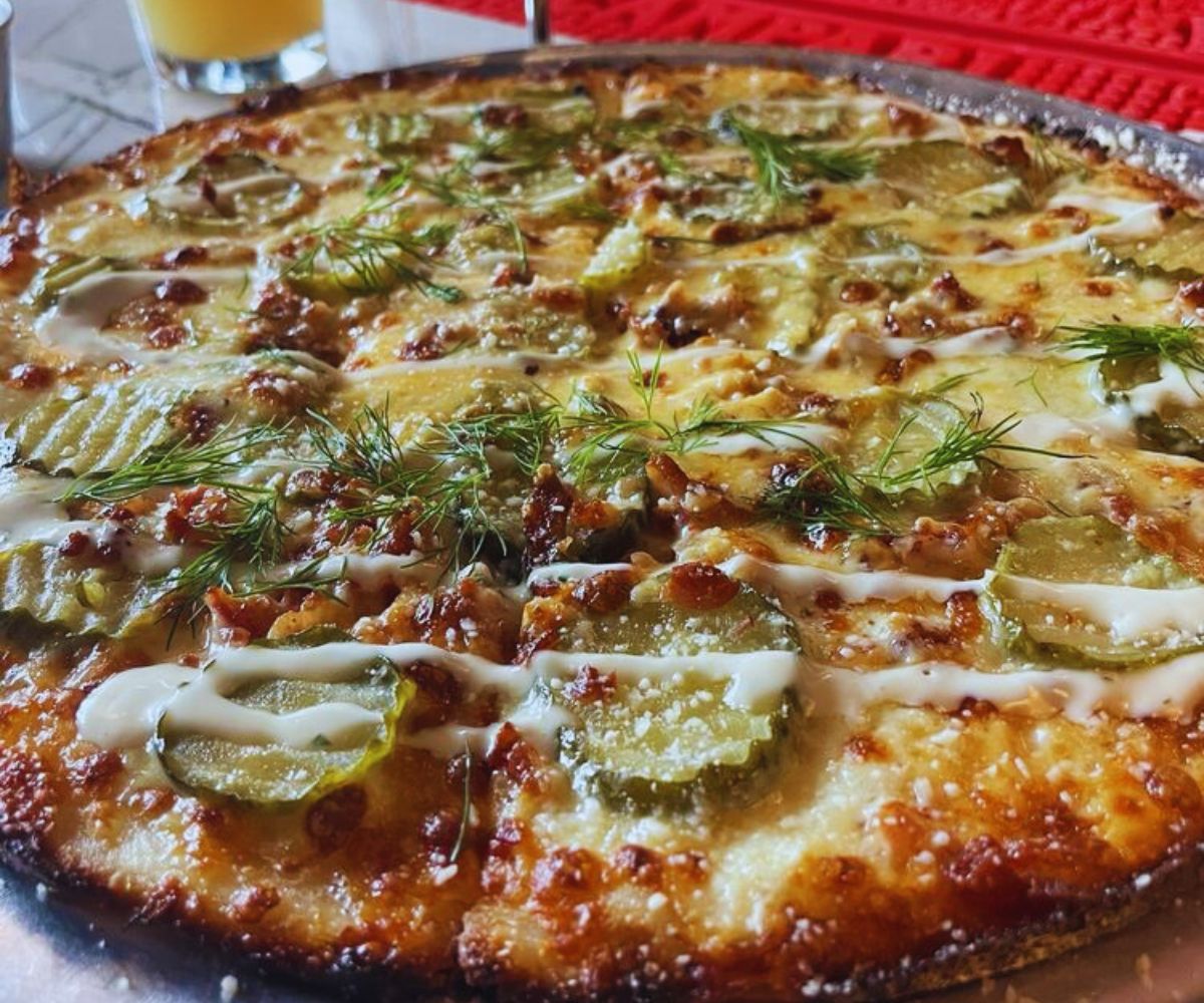 Pickle Pizza (Bar Style): Thin, crispy bar‑style crust topped with roasted garlic and chili pepper cream sauce, bacon, sweet and spicy pickles, fresh dill, and ranch drizzle gives diners a crunchy, tangy, creamy experience that regulars love to push on friends as the “trust me, you’ll crave this later” order. 🥒