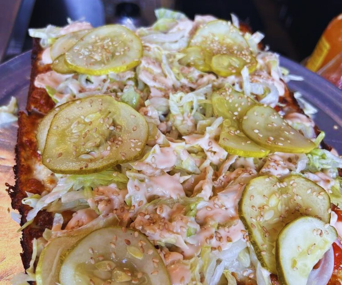 Deep Dish Big Mack Pizza: Impossible burger crumble, vegan mozzarella, vegan Thousand Island, pickles, iceberg lettuce, onions, and sesame seeds mash up fast‑food nostalgia with Detroit deep dish, letting vegans and curious omnivores enjoy a playful, loaded, “burger‑meets‑pizza” experience that’s tailor‑made for sharing pics and bites. 🌱