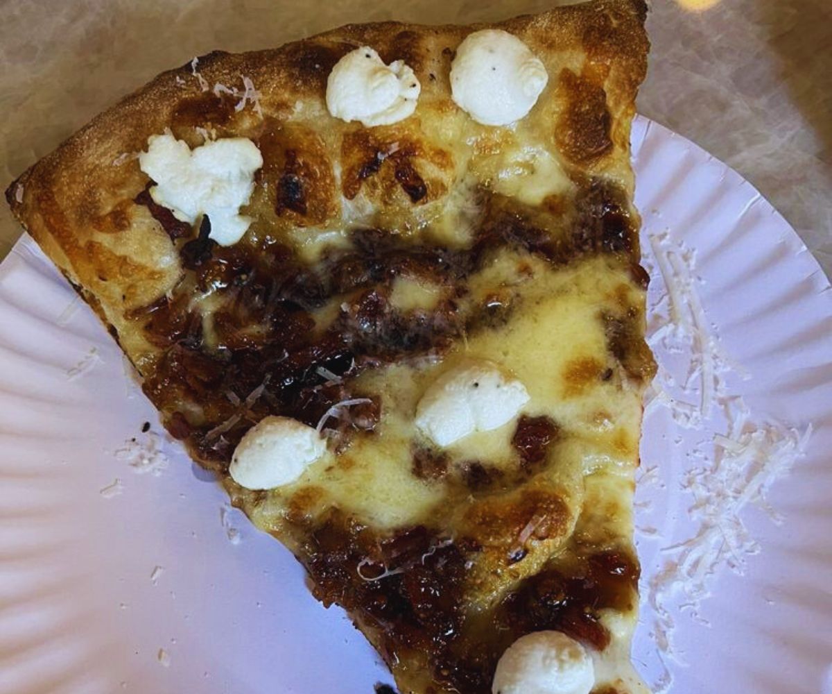 Forbidden Fruit: A sauce-free white pie topped with shredded mozzarella, fresh mozzarella, fig jam, and bacon, this is Forbidden Pizza’s sweet-and-savory showstopper that offers a combination of smoky bacon and sticky-sweet fig jam, which pairs beautifully with the thin, crunchy base. 🥓