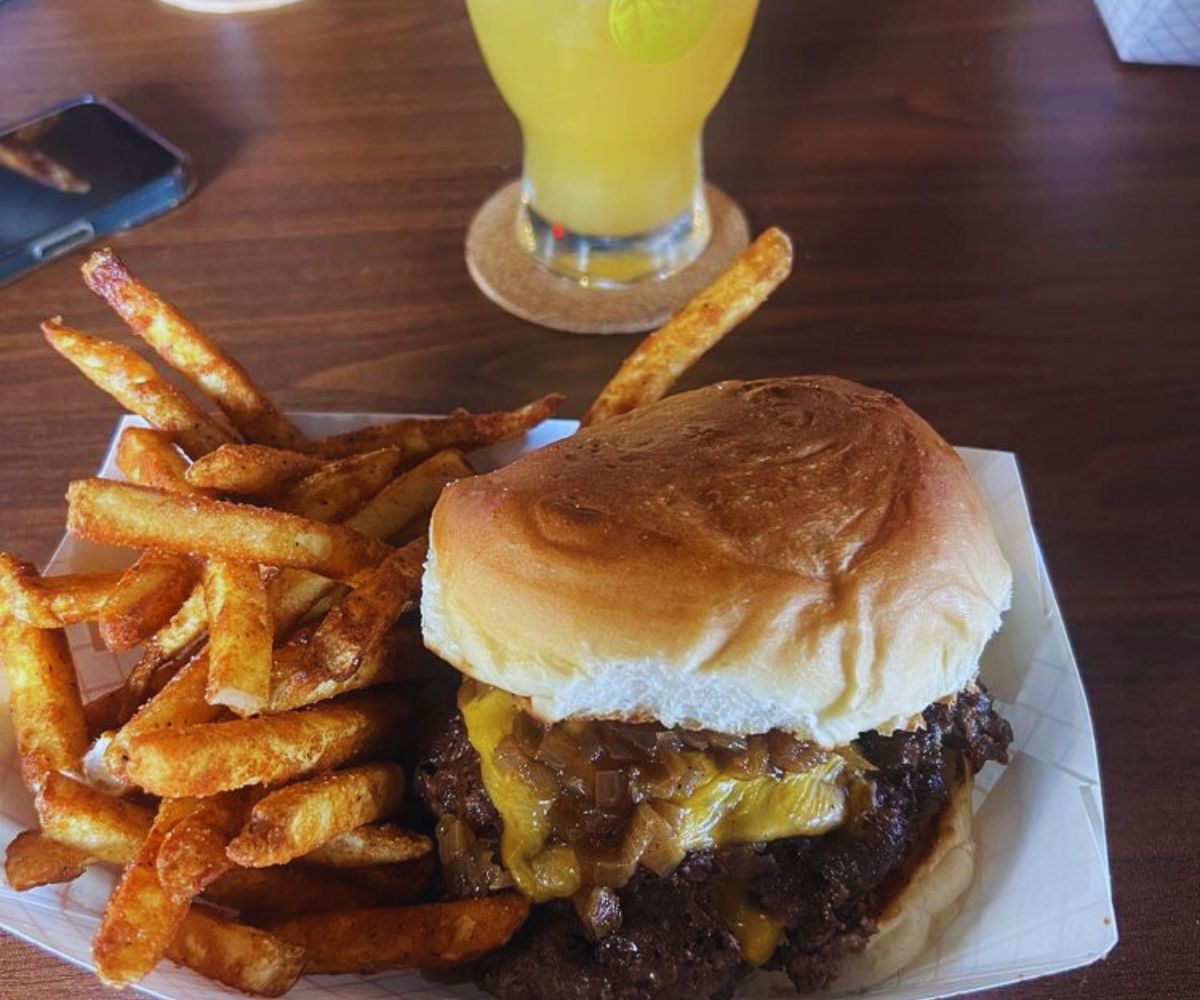 The Oklahoma Burger: Featuring two patties, American cheese, black truffle mayo, pickles, thin‑sliced onions, and onion straws, this rich and savory option takes classic smash burger vibes and layers in truffle depth plus crisp onion texture for a more indulgent, umami‑heavy experience that feels tailor‑made for beer lovers.