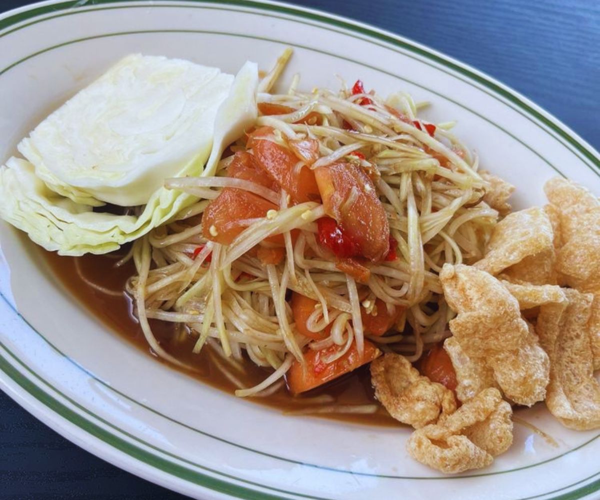 Lao Papaya Salad: Shredded green papaya tossed with lime, fish sauce, chiles, garlic, tomatoes, and herbs in a Lao-style mix that’s light, crunchy, and intensely sour-spicy, giving customers a refreshing yet fiery experience that wakes up the palate and pairs perfectly with grilled meats. 🥗🔥