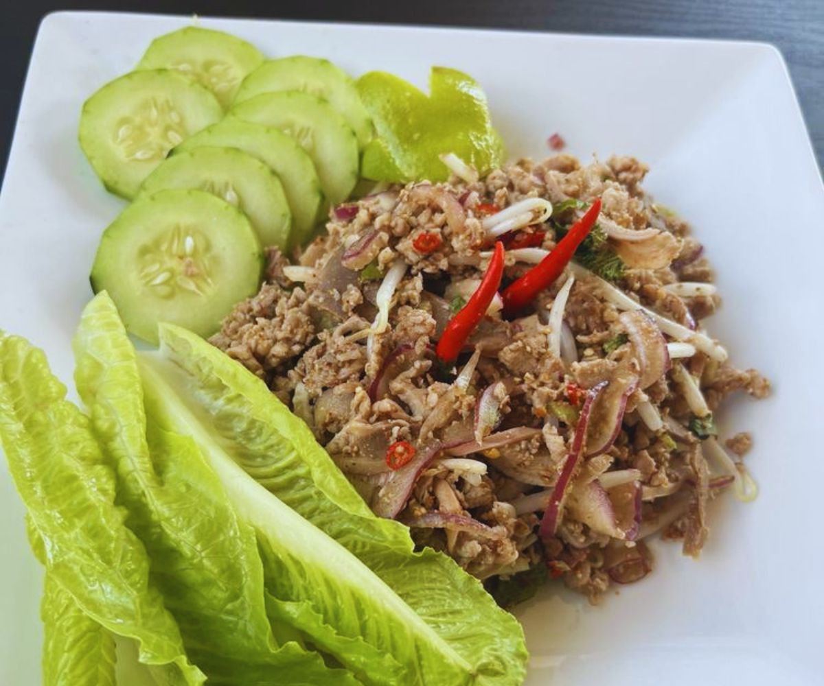 Pork and Chicken Larb: Finely minced pork or chicken gets tossed with lime juice, roasted rice powder, fresh mint, cilantro, scallions, and chiles, creating a bright, zesty, slightly spicy meat salad that delivers a punchy, ultra-fragrant experience fans describe as “addictive” and perfect with sticky rice or a cold drink.