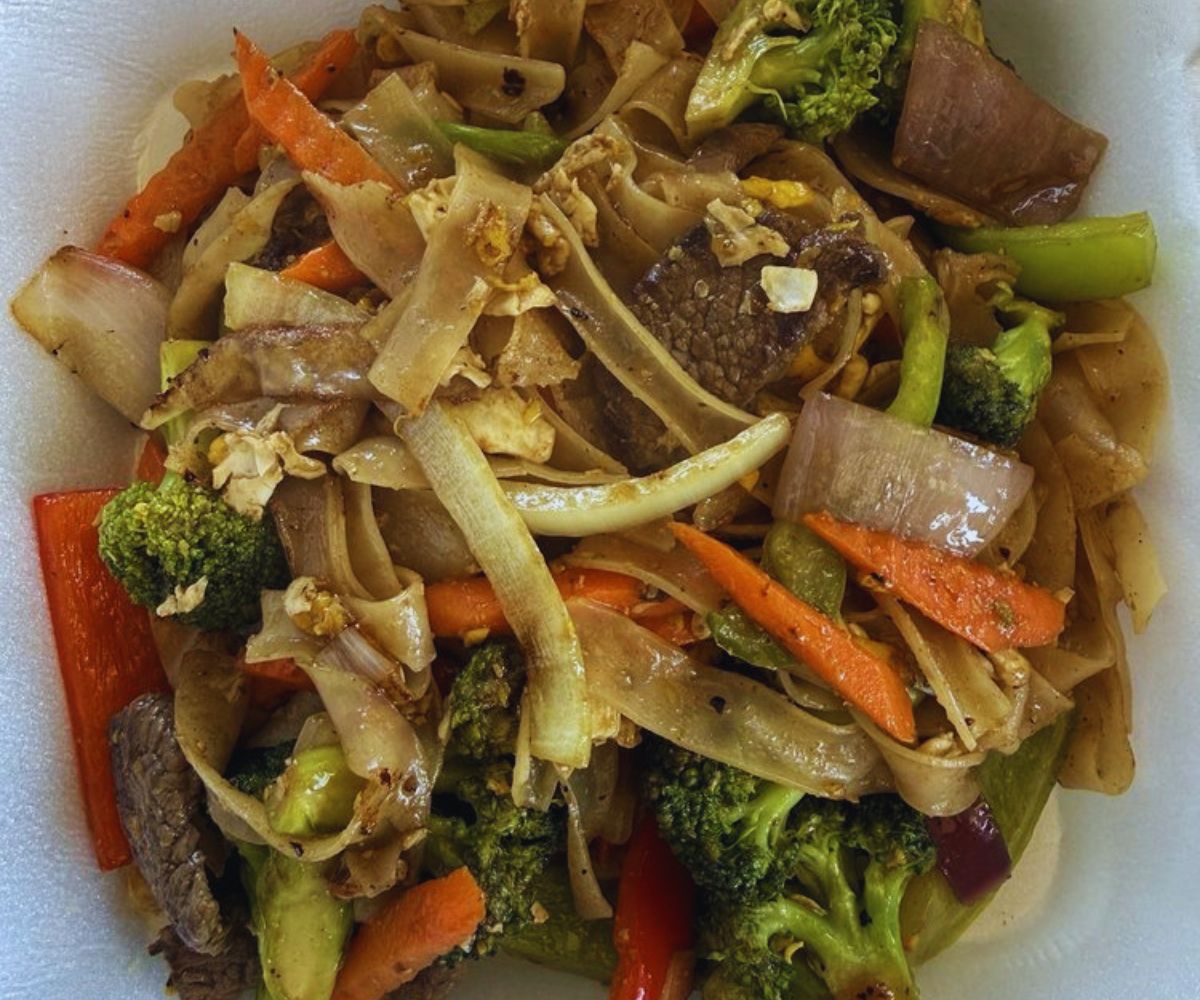Pad See Ew Beef: Wide rice noodles stir-fried with beef, egg, and Chinese broccoli in a slightly sweet soy-based sauce pick up a gentle wok char, offering diners a chewy, smoky, deeply comforting plate that feels like a Thai-style hug in a bowl and a natural favorite for carb-lovers. 🍜