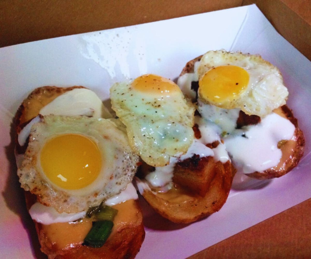 Quail Eggs & Loaded Potato Skins: Potato skins topped with crispy pork belly, gouda, charred scallion crema, and delicate quail eggs deliver a rich, smoky, slightly fancy take on classic bar food, giving diners a salty, decadent snack that feels special but still totally approachable with a pint in hand.