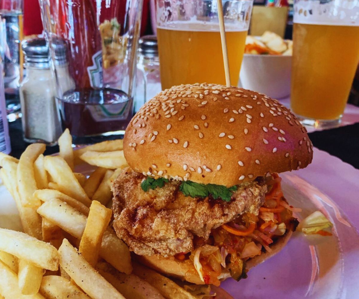 Fried Chicken Sando: Buttermilk fried chicken breast on a sesame bun with spicy slaw and house pickles hits that crunchy, tangy, lightly spicy sweet spot, giving guests a crave‑worthy, two‑hand, napkin‑required sandwich that pairs perfectly with a cold beer and late‑night chatter. 🍗