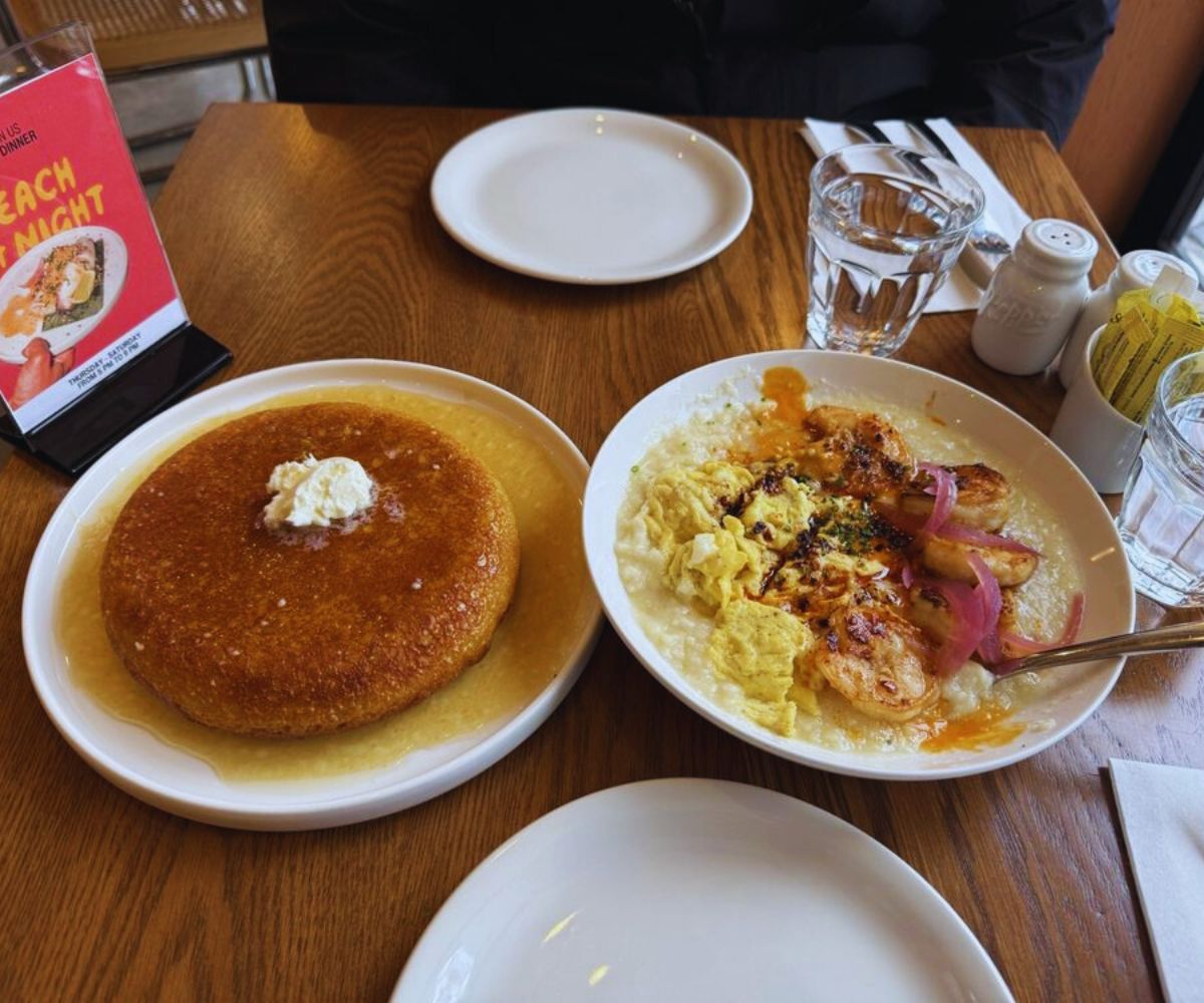 Golden Pancakes: Two fluffy pancakes with honey butter and bright lemon zest, with options for a smaller single stack that’s ideal for diners who want something classic yet slightly elevated, or for the group that orders one plate “for the table” alongside more savory options. 🥞