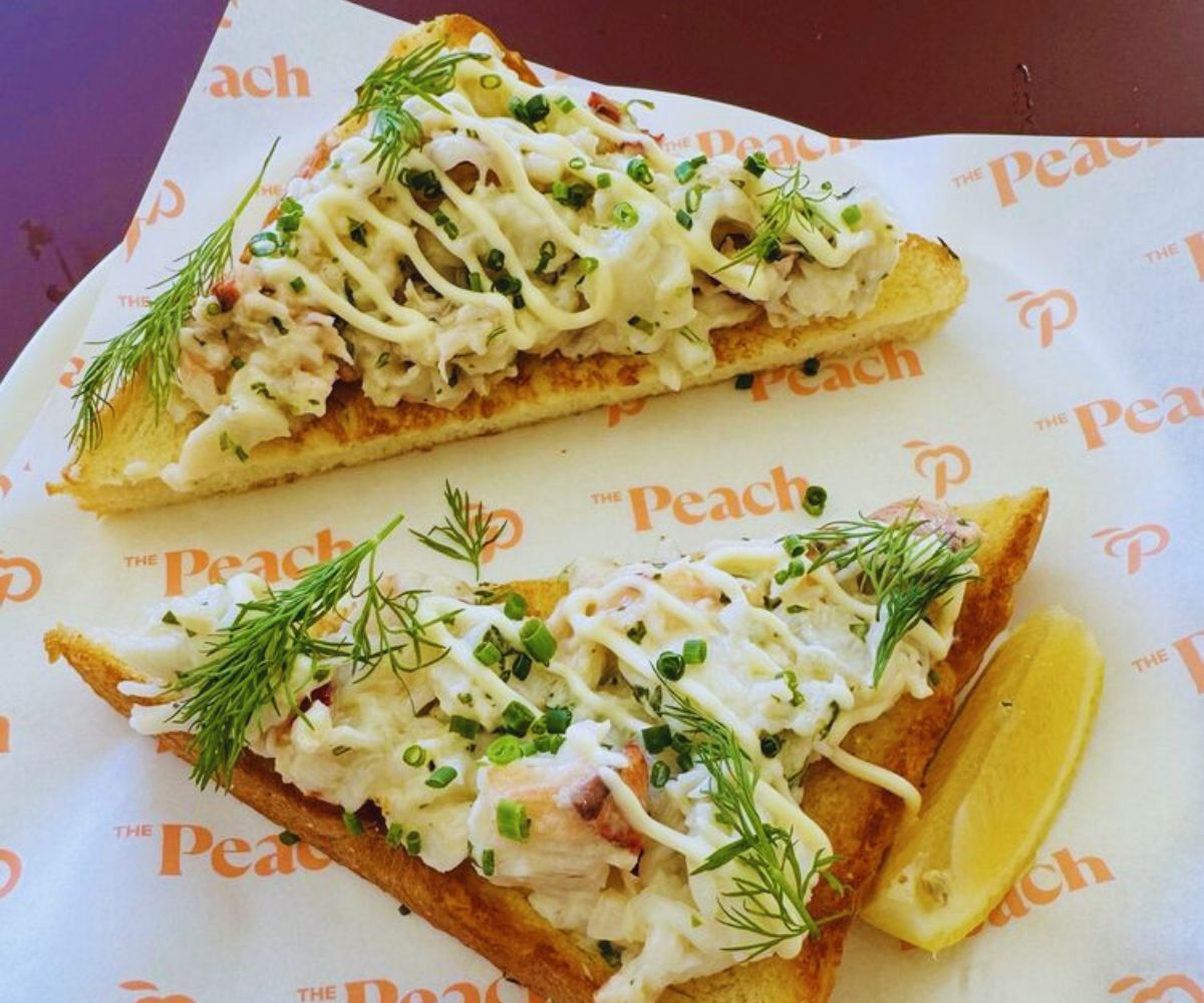 Lobster Toast: One of the reimagined brunch dishes that defines The Peach’s style, the combination of rich lobster, soft milk bread, and herb‑bright aioli gives an upscale edge to the toast game, making it a household favorite. 🦞