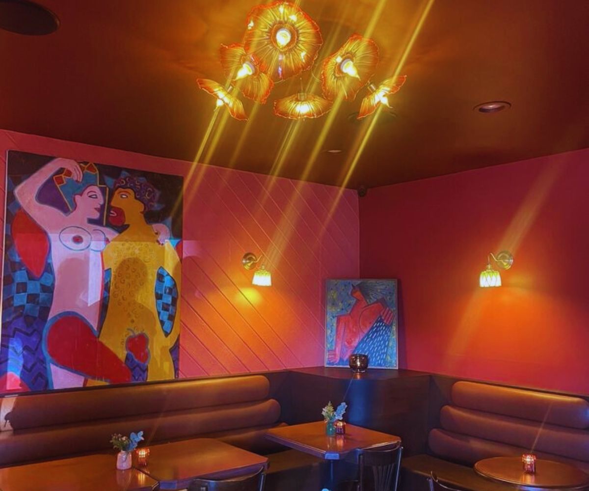 The moody red lighting, rainbow‑lit patio, and whimsical art make it date‑night gold, while the order‑at‑the‑counter ease keeps things relaxed with delicious food that makes the entire experience special.