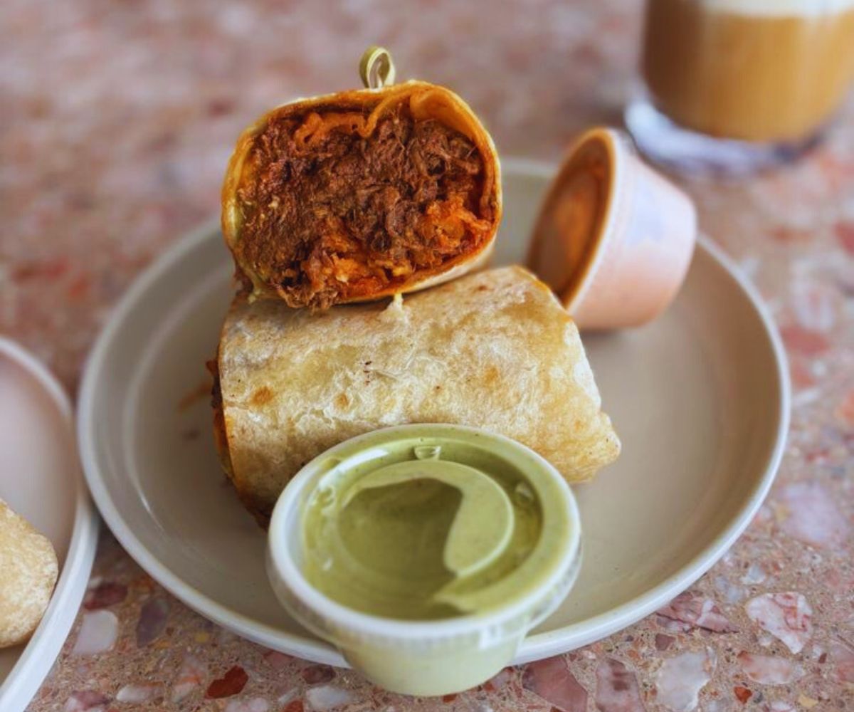 Birria Breakfast Burrito: This house favorite wraps 6‑hour slow cooked certified angus beef (what that means), soft scrambled eggs, chives, queso chihuahua, avocado, and tater tots into an organic‑flour tortilla with cilantro tomatillo and chipotle cremas, making it a rich, limited‑quantity burrito that fans line up early to snag. 🌯🔥