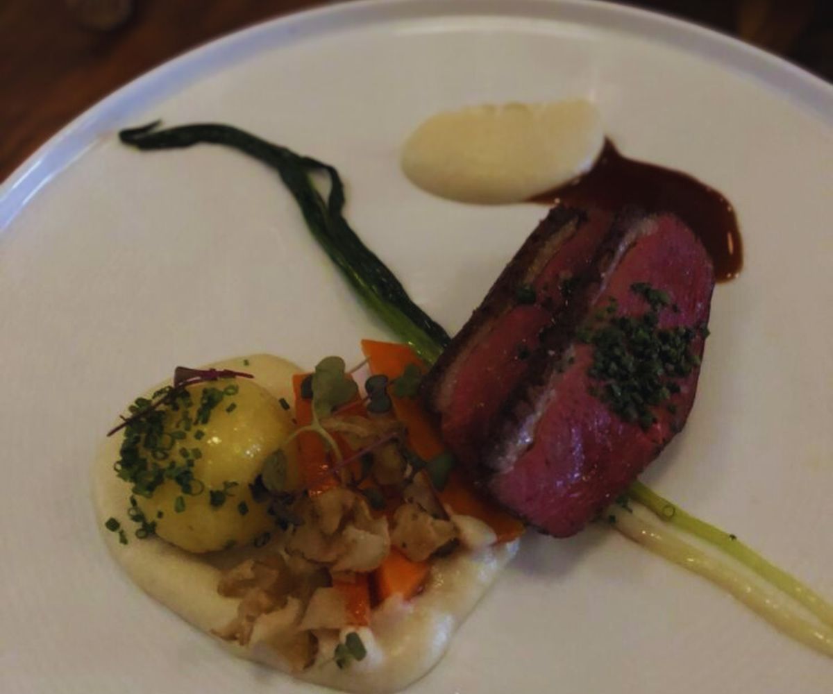 Eye of Ribeye with Bacon and Mushroom Quenelle: The excellent steak is better than what you’ll find at most Nebraska steakhouses, finished with a tremendous quenelle of bacon and mushrooms that nearly upstages the beef itself.
